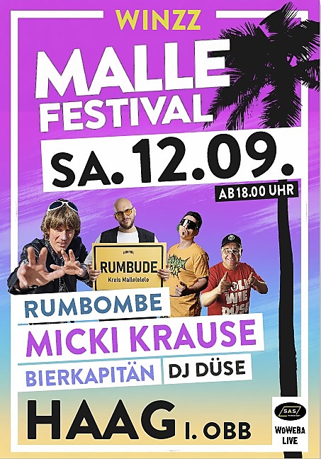 Mallorca-Feeling mitten in Haag: Beim WINZZ Malle Festival erwartet euch am Samstag, 12.09. ab 18:00 Uhr eine große Party mit echten Ballermann-Stars. Freut euch auf Micki Krause, Rumbombe, Bierkapitän und DJ Düse und feiert zu den größten Malle-Hits.